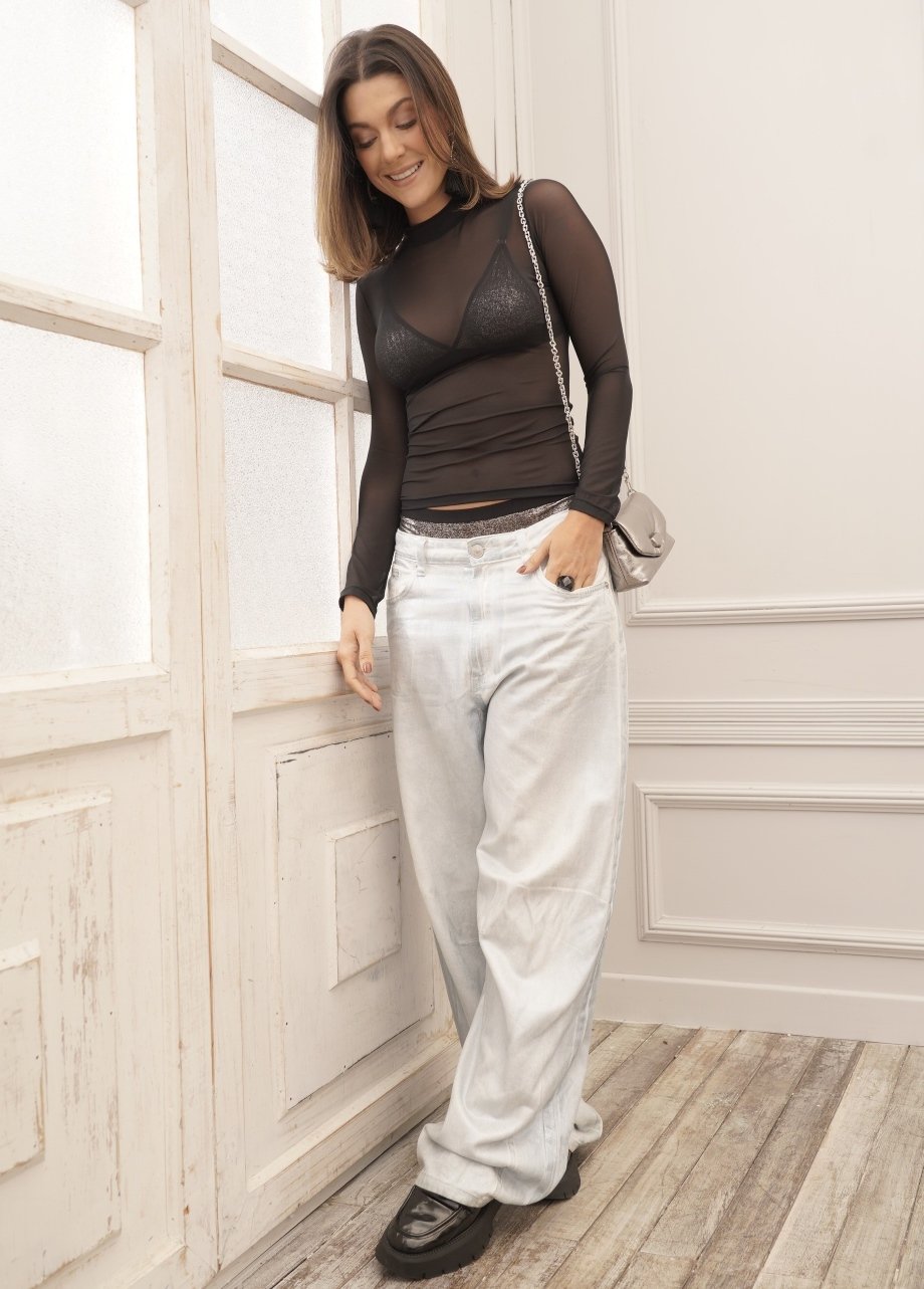 Este top transparente de cuello alto y manga larga, puede ser la forma más sofisticada de lucir tu sujetador favorito. Está confeccionado con tull suave, elástico y un poco atrevido, si así lo deseas. Llévalo con un blazer o con tu denim favorito. Brillantez absoluta.